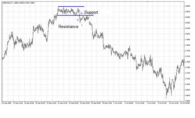 بالإضافة إلى خطوط الاتجاه، يمكن أن يكون الانخفاض والارتفاع بمثابة مستويات دعم ومقاومة (الشكل 6 والشكل 7). ومع ذلك، فإن الارتفاع أو الانخفاض السابق لا يعني أنه المستوى الذي سيقفز منه السعر مرة أخرى. يخبروننا أنه عندما يتحرك السعر بالقرب منهم، فإنه قد يلتقي بمستوى الدعم أو المقاومة بالقرب من القاع أو الارتفاع لأن السوق يتذكر أنه كان هناك تكافؤ بين الثيران والدببة عند هذا المستوى، وعندما يقترب السعر من المستوى مستوى الدعم يبدأ الجميع بالشراء، وعندما يقترب من مستوى المقاومة، على العكس، يبدأون بالبيع. يمكن اعتبار اختراق الحد الأدنى أو الحد الأقصى السابق بمثابة إشارة لمزيد من الانخفاض أو الارتفاع في الأسعار.