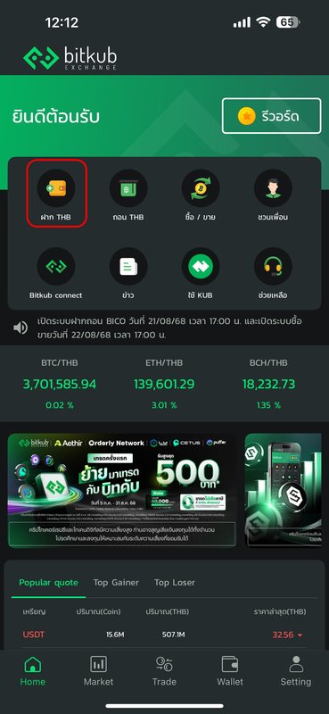 C6. หลังจากโอนเงินเข้า Bitkub แล้ว ก็สามารถซื้อเหรียญคริปโต USDT/USDC ได้โดยกลับมายังหน้าเว็บ Bitkub > ไปที่สัญลักษณ์รูปคน > หน้าหลัก