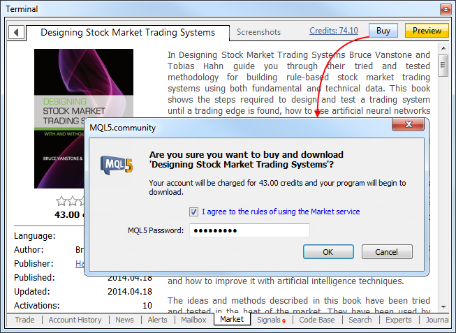 To continue, agree to the rules of using the Market service and enter your MQL5.community password. After that, the specified amount of funds will be withdrawn from your account and the book will be downloaded. Buy button will be replaced by Open one.