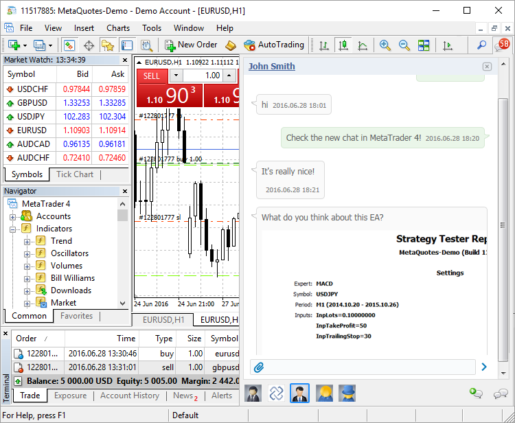 1. Terminal: New built-in chat. Now, traders can chat with their MQL5.community friends and fellow traders straight from the platform. The chat maintains the history of messages, as well as it features the number of unread messages. To start a chat, log in to your MQL5 account straight from the chat window or via the platform settings: 'Tools' -> 'Options' -> 'Community'.